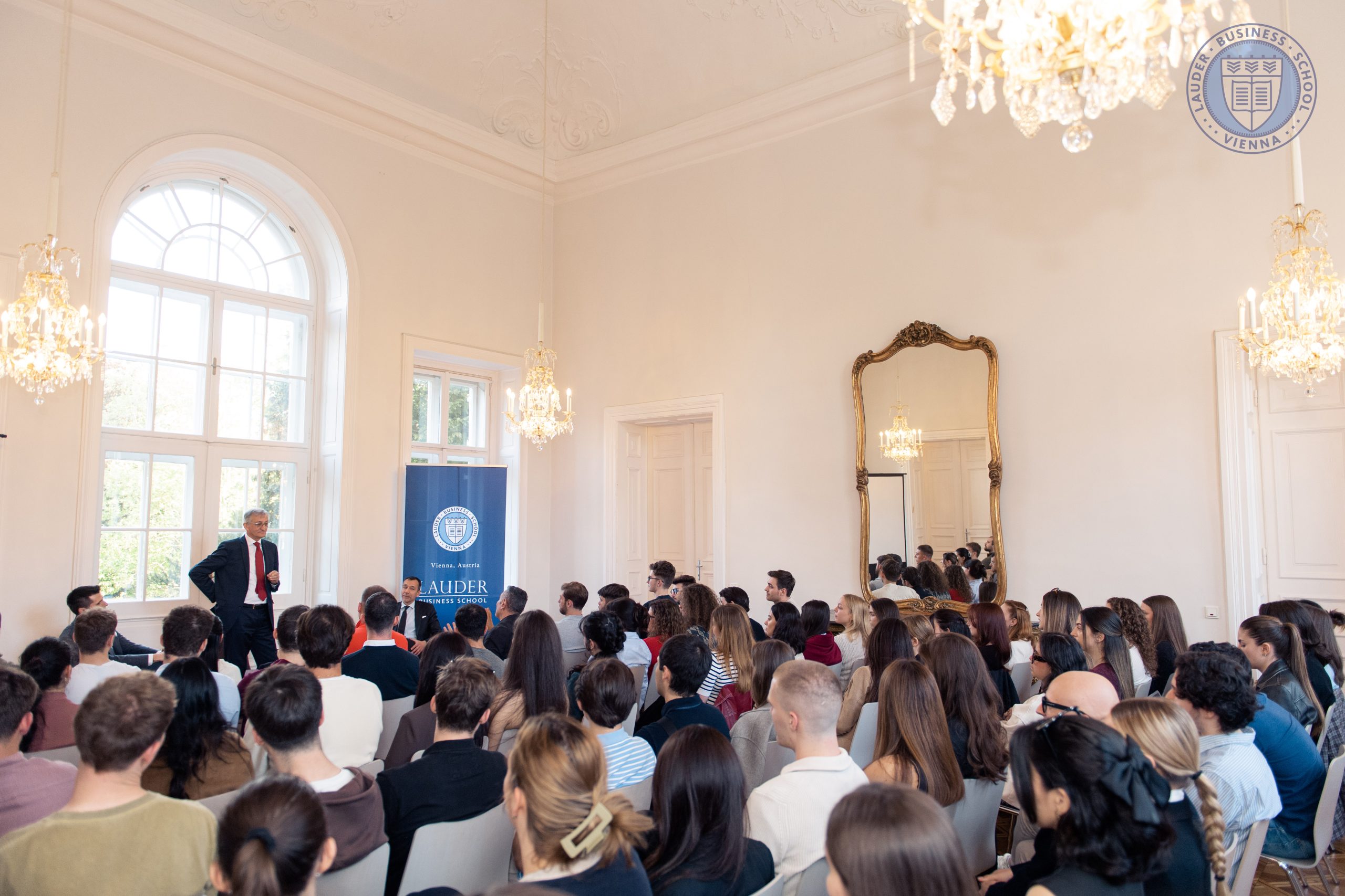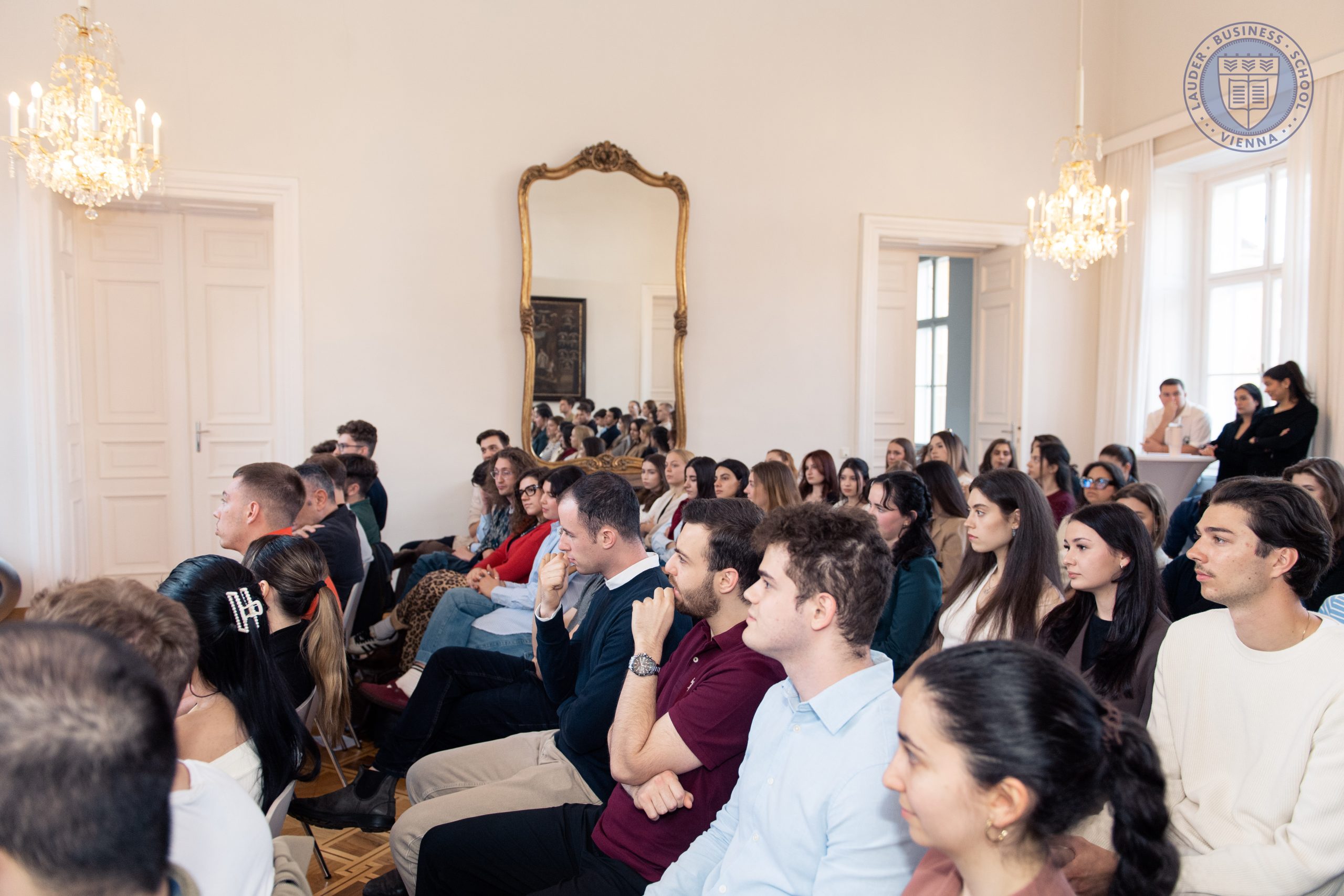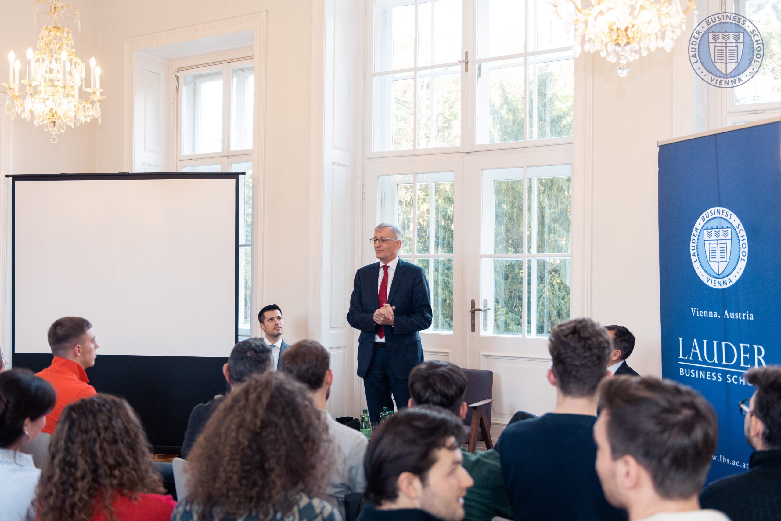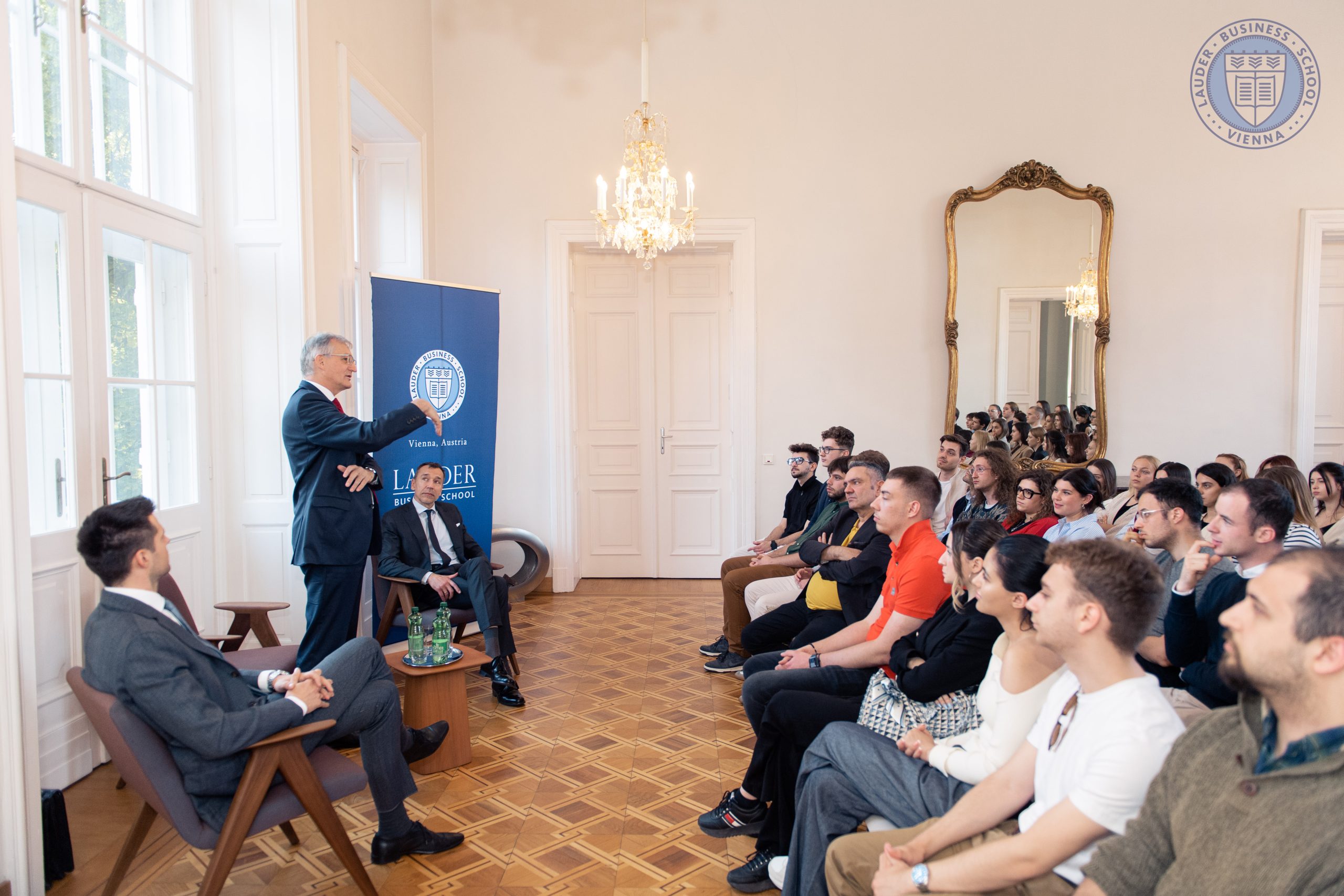 Last night, Lauder Business School hosted a Fireplace Talk that featured Johannes Koller, the Managing Director, Head of Investment Solutions & Services at Unicredit Bank Austria and Schoellerbank, as a guest speaker. The question-and-answer session between Mr. Koller and the LBS students covered our speaker´s multifaceted career in engineering, the military, banking, and finance, discussing career development, the future of finance in light of digitalization and AI, necessary skills (both hard and soft), and the significance of ESG risks in the financial sector. Mr. Koller highlighted the value of university education as a practice ground and offered perspectives on gender disparities in the workplace.